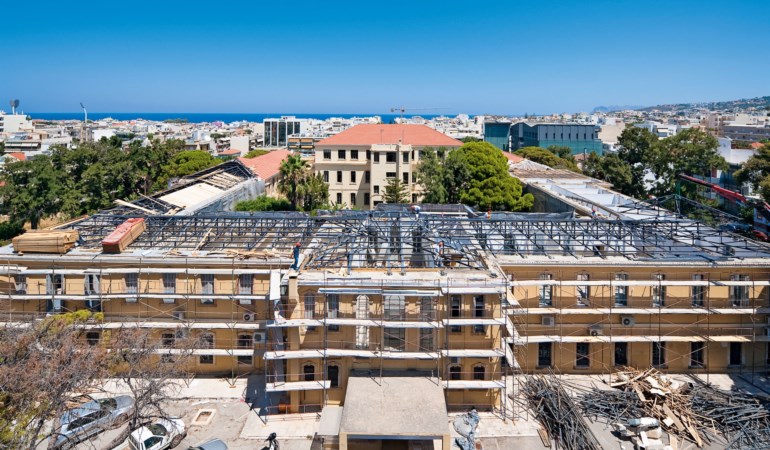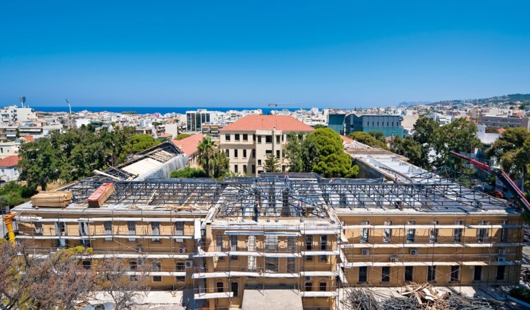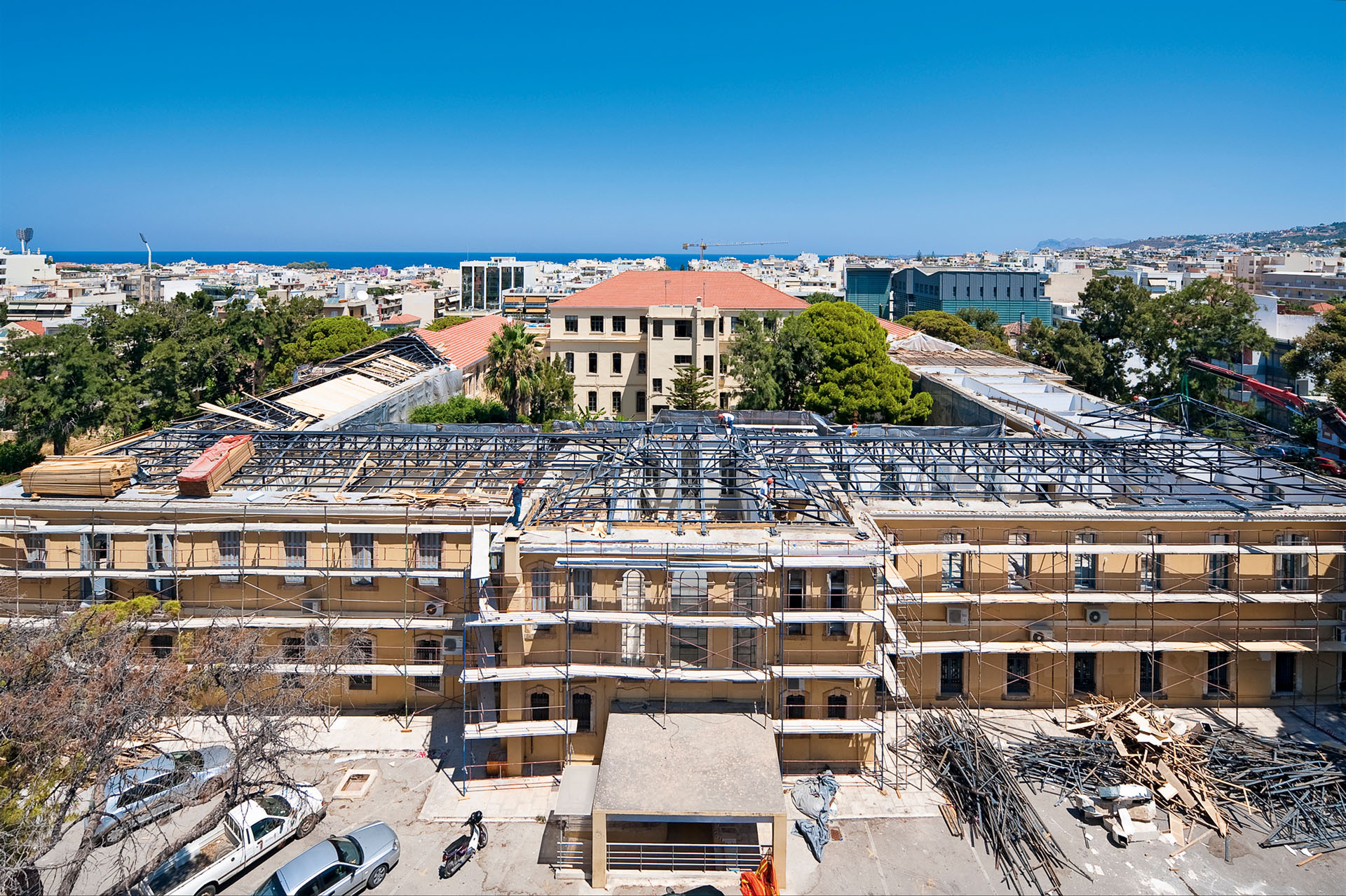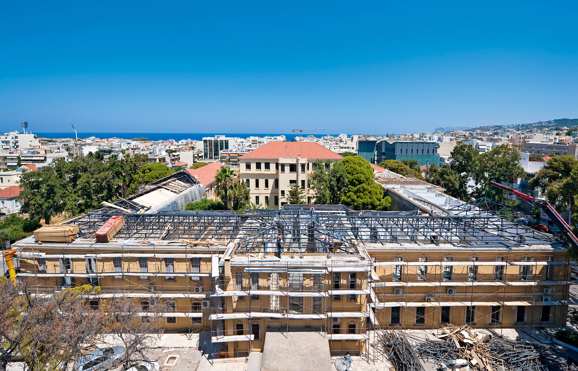 Κατασκευή και τοποθέτηση της νέας στέγης στη Δημοτική Αγορά Χανίων, στο πλαίσιο του έργου αποκατάστασης του κτηρίου.